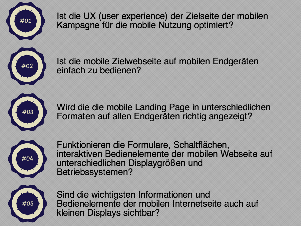 - Ist die UX (user experience) der Zielseite der mobilen Kampagne für die mobile Nutzung optimiert?
