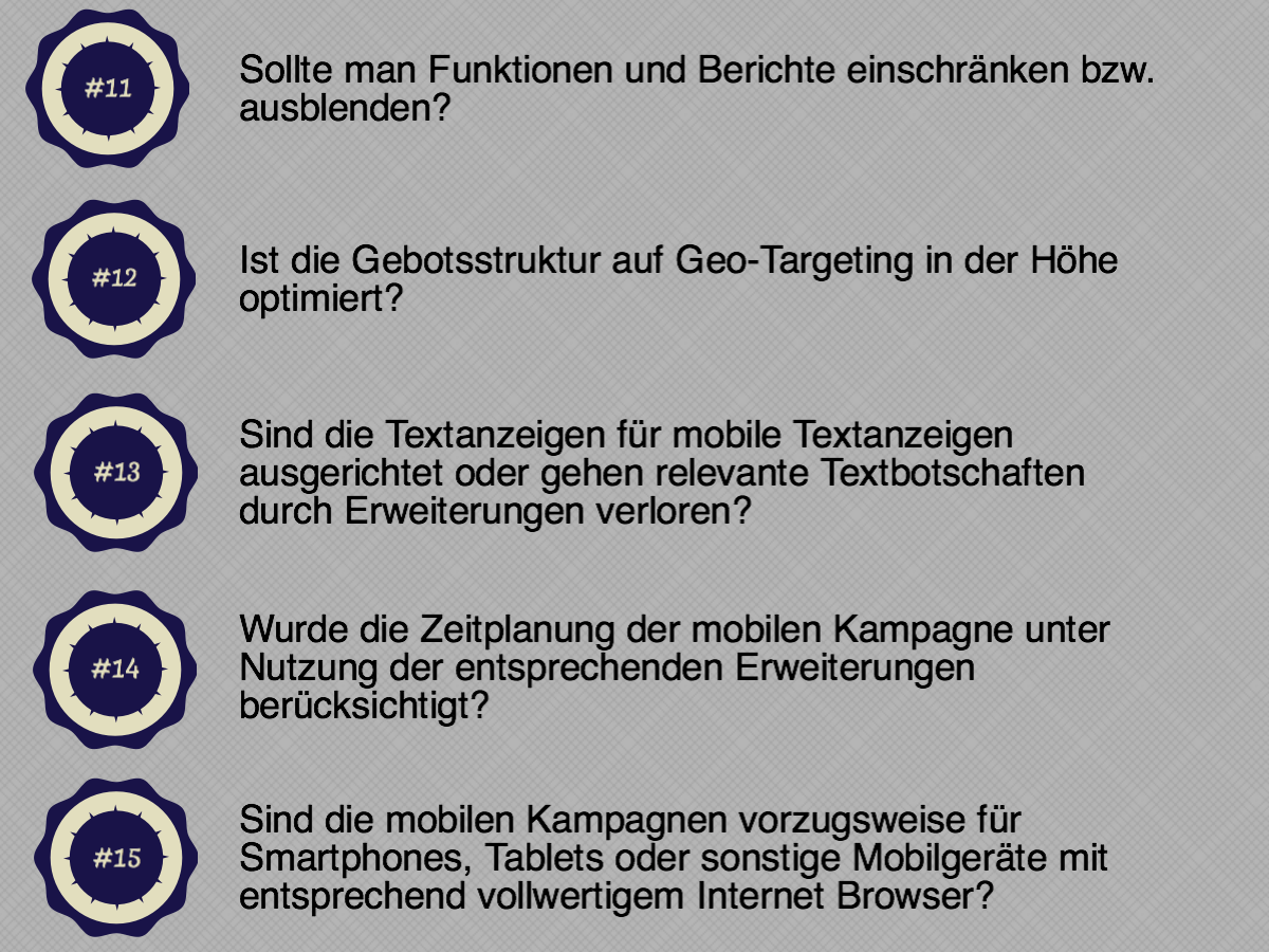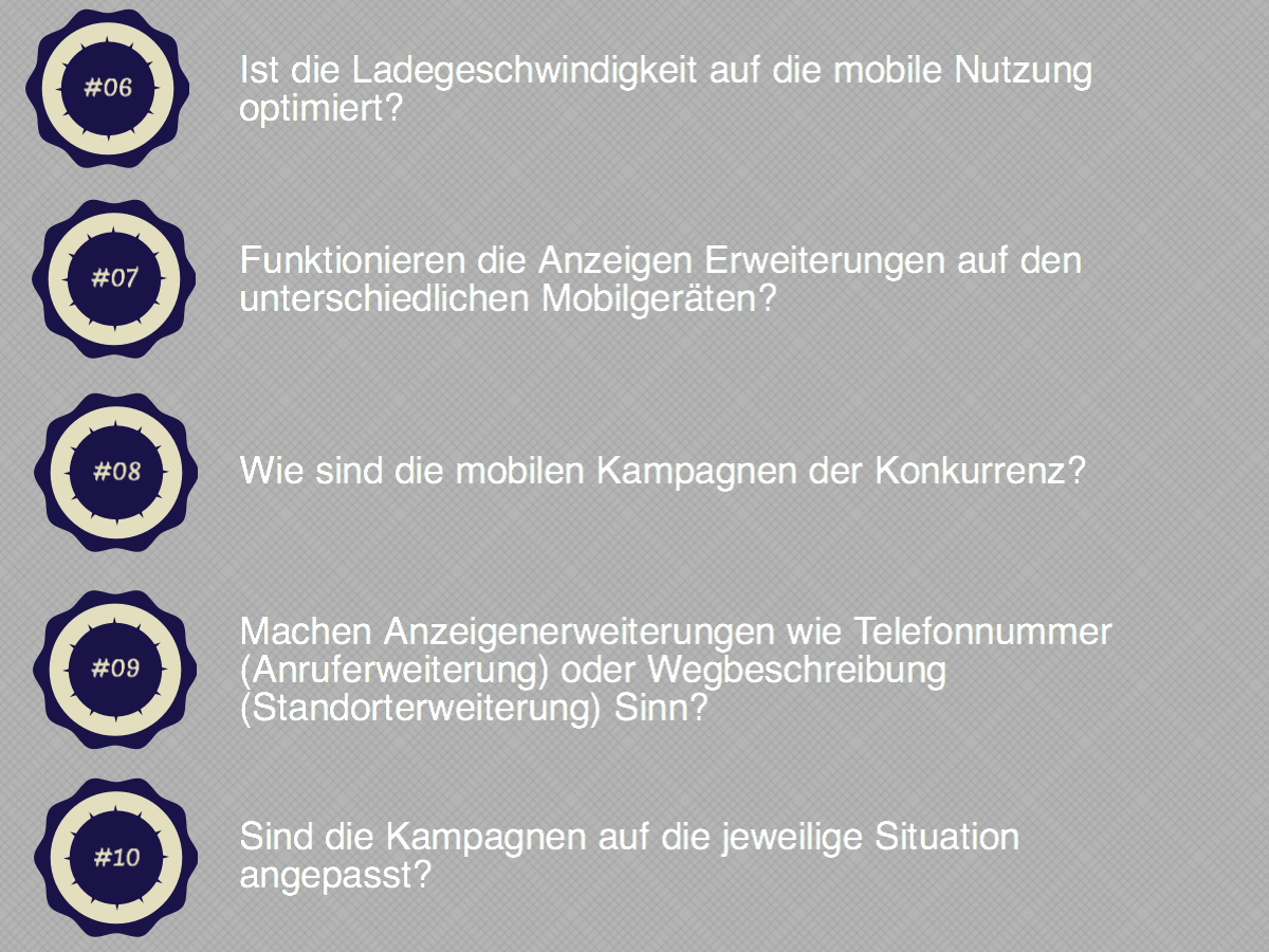 Überprüfen Sie, ob die ausgelieferten Adwords, Display Kampagnen, call-to-action Elemente usw. auf den mobilen Alleskönnern auch richtig funktionieren und für die mobilen Suchergebnisse ausgerichtet sind. ACHTUNG! Schnell hat man etwas übersehen oder nicht beachtet. Die folgende Checkliste soll eine schnelle Übersicht über die Optimierungsmöglichkeiten verschaffen und die Qualität ihrer mobile Kampagnen steigern.