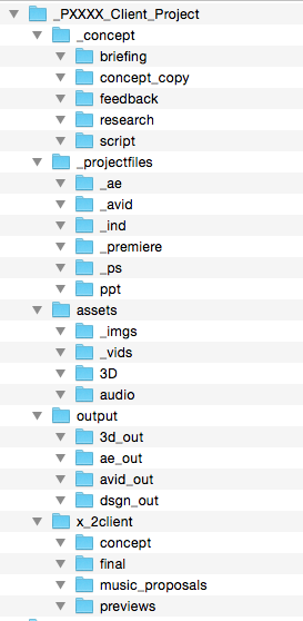 A common question is how to organize the folders for commercial film projects as well as motion graphics projects. We tested a lot of variations. To achieve consensus is a process which we monitor and discuss with the whole team periodically. Currently we are working with following folder structure.